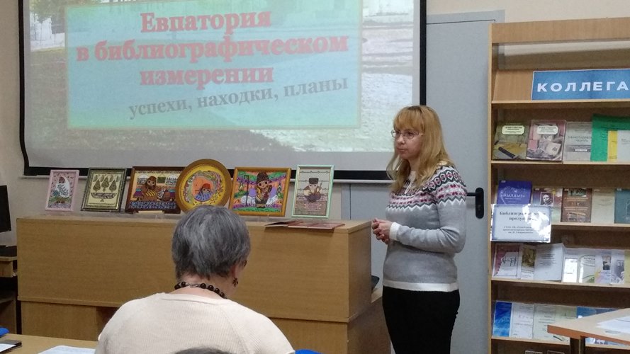Заведующая методико-библиографическим отделом Центральной городской библиотеки им. А. С. Пушкина г. Евпатория Янина Грошева представила выступление: «Евпатория в библиографическом измерении: успехи, находки, планы».