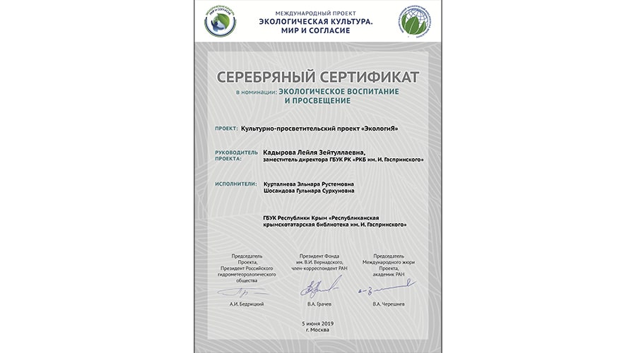 По итогам конкурса Республиканская крымскотатарская библиотека им. И. Гаспринского получила Серебряный сертификат за участие в номинации «Экологическое воспитание и просвещение».