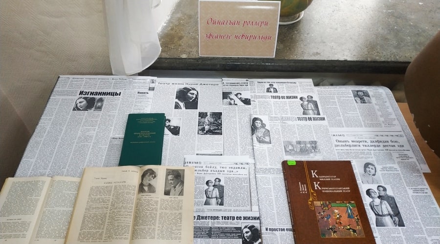 Наряду с книгами разных авторов об истории крымскотатарского театра заслуживает внимания программа к спектаклю «Багъчасарай чешмеси» («Бахчисарайский фонтан») 1939-1940 годов. Известно, что роль Заремы, которую играла актриса, была специально написана для Нурие Джетере. Ее супруг – актер и режиссер, заслуженный артист Крымской АССР, народный артист Дагестана Сервер Джетере – был режиссером данной постановки и играл роль визиря Нурали. Среди материалов выставки вниманию читателей также представлены публикации о Нурие Джетере из периодической прессы.