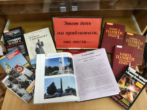 2 сентября 2016 года в связи с празднованием Дня окончания Второй мировой войны в читальном зале Государственного бюджетного учреждения культуры Республики Крым «Крымскотатарская библиотека им. И. Гаспринского» была организована тематическая полка «Этот день мы приближали, как могли». На ней представлены материалы о самой крупной в истории человечества войне, которая продолжалась шесть лет – с 1 сентября 1939 года по 2 сентября 1945 года.