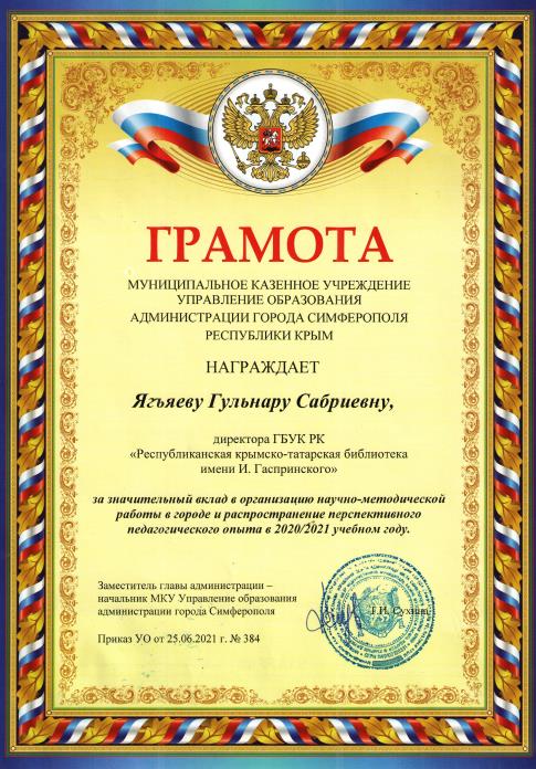 За многолетнее межведомственное сотрудничество со школьными библиотеками города Симферополя коллектив республиканской библиотеки был отмечен грамотой за значительный вклад в организацию научно- методической работы в городе и распространение перспективного педагогического опыта.