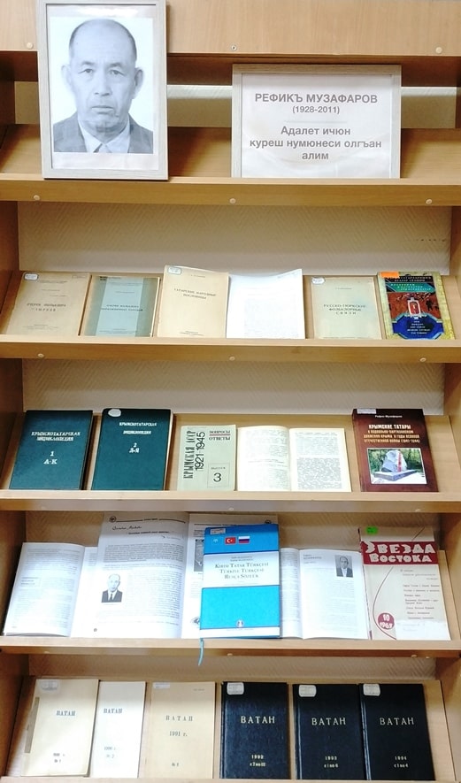 Специалистами библиотеки в рамках мероприятия в читальном зале была подготовлена выставка «Адалет ичюн куреш нумюнеси олгъан алим» («Учёный – образец борьбы за справедливость»), включающая научные труды, книги, коллекцию журналов «Ватан» (гл. ред. Р. Музафаров), 2-х томное издание «Крымскотатарской энциклопедии» (сост. Р. Музафаров), статьи учёного по фольклору крымских татар, а также материалы, посвященные жизни и деятельности учёного из фондов библиотеки.