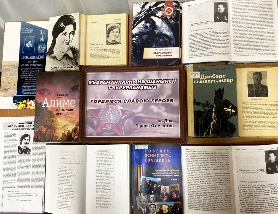 Вниманию читателей представлены книги Аблязиза Велиева «Къараманлар ольмейлер» («Герои бессмертны») на двух языках, где рассказывается о представителях крымскотатарского народа – Героях Советского Союза, полных кавалерах ордена Славы, генералах, командирах и комиссарах полков и дивизий, подводных кораблей, партизанских соединений, а также о тех, кто в своё время был официально представлен, но так и не удостоился высокой правительственной награды. Отдельный очерк повествует о боевом пути артиллериста, Героя Советского Союза Сеитнафе Сеитвелиева, жизнь которого демонстрирует собой яркий пример мужества. В биографической книге Владимира Лоты «Алиме» в подробностях восстановлена история фронтовых подвигов военной разведчицы, которой в сентябре 2014 года было посмертно присвоено звание Героя России. Тематику выставки также продолжают статьи из периодической печати, среди которых особо стоит отметить очерк писателя-фронтовика Сейтумера Эмина «Алиме – звучит гордо».